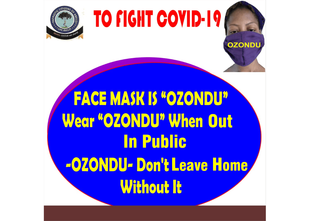 Owerri, Imo State, May 9, 2020*: The Patriotic Citizens of Amuzi (PCA), a Non-Governmental Organization focused on the developmental interests of the Amuzi Autonomous Community, of over 20,000 people, in Ahiazu Mbaise, Imo State Nigeria, recently rebranded the Face Mask, as “ozondu”, which means “life saver” in Igbo language. The group is now set to launch the “Ozondu for All” initiative, to provide face masks against COVID-19, for all her citizens resident in the community.