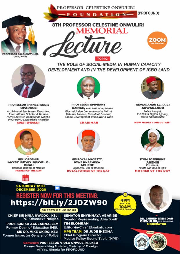 December 6,2020: Today a nongovernmental organization, the Patriotic Citizens of Amuzi (PCA), based in Amuzi, Ahiazu-Mbaise Imo State, announces the invitation from the Professor Celestine Onwuliri Foundation (PROFOUND)- a Nigeria based Non-profit, Non-governmental, organization, requesting its Convener, Professor Eddie Oparaoji, to be the 2020 Guest Speaker at the 8th Professor Celestine Onwuliri Memorial Lecture, taking place on Saturday, December 12, 2020, at 4pm Nigeria Time/ 10am ET (US & Canada). To register to attend this lecture via Zoom, click https://bit.ly/2JDZW9O